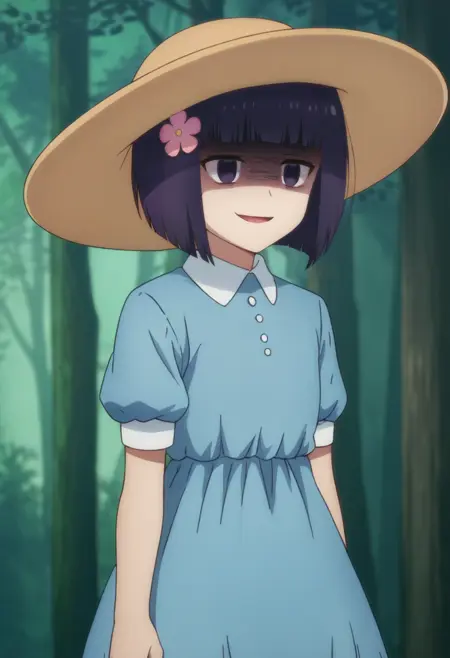 hair flower, blue dress, puffy sleeves, sun hat,