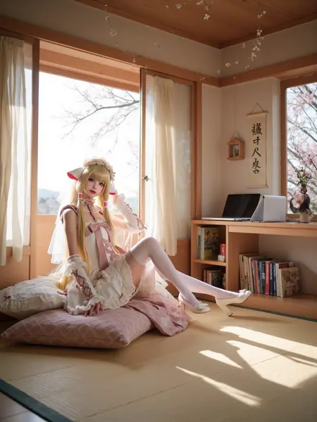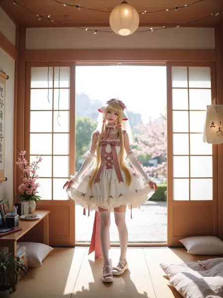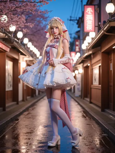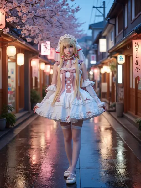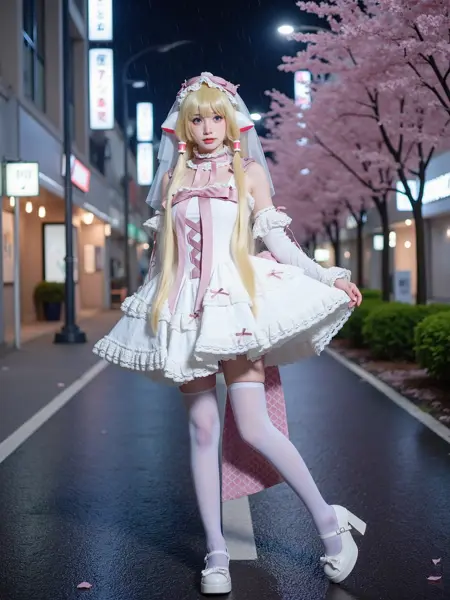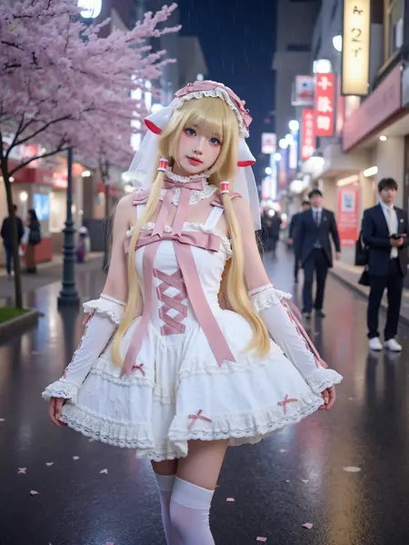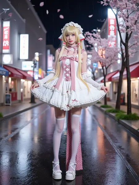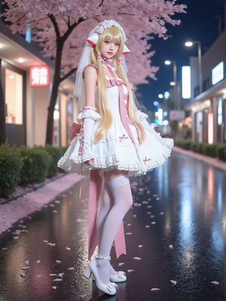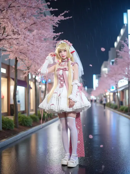 チョビッツのチーのコスプレ衣装を着た美しい女性の写真。彼女は、外側の袖と外側のカラーがついた白いフリル付きクロスレースドレスを着ており、ドレスにはフリル、リボン、ボウが施されている。また、白いタイツハイズと白いハイヒールを履いている。彼女はロボットの耳を持ち、長い金色の髪にヘアチューブ、フリル付きヘアバンド、ベールを併せ持っている。背景は、多くの店舗と看板がある日本の街並みで、道路の両脇には桜の木があり、桜の花びらが雨の夜に降り注いでいる。写真は全身が見えるフルショットで、背景も詳細に描写されている。
