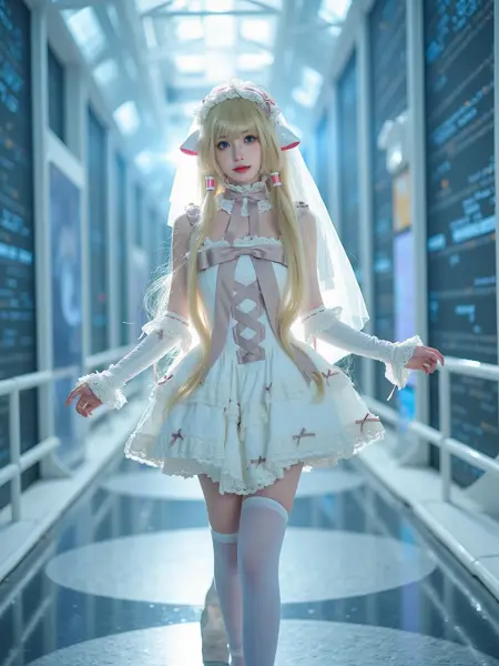 チョビッツのチーのコスプレ衣装を着た美しい女性の写真。彼女は、外側の袖と外側のカラーがついた白いフリル付きクロスレースドレスを着ており、ドレスにはフリル、リボン、ボウが施されている。また、白いタイツハイズと白いハイヒールを履いている。彼女はロボットの耳を持ち、長い金色の髪にヘアチューブ、フリル付きヘアバンド、ベールを併せ持っている。