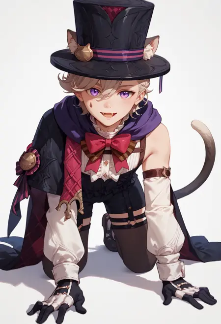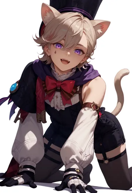 lyney, 1boy, male focus, tail, animal ears, hat, bow, gloves, cat tail, purple eyes, cat ears, solo, cat boy, thighhighs, black gloves, otoko no ko, fang, top hat, looking at viewer, tail ornament, open mouth, shorts, bowtie, all fours, red bow