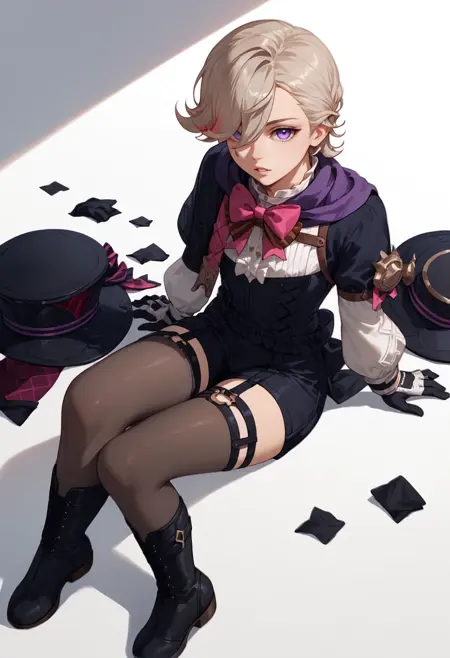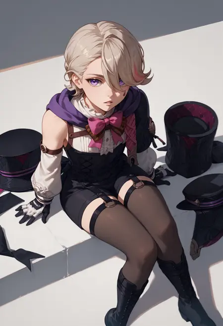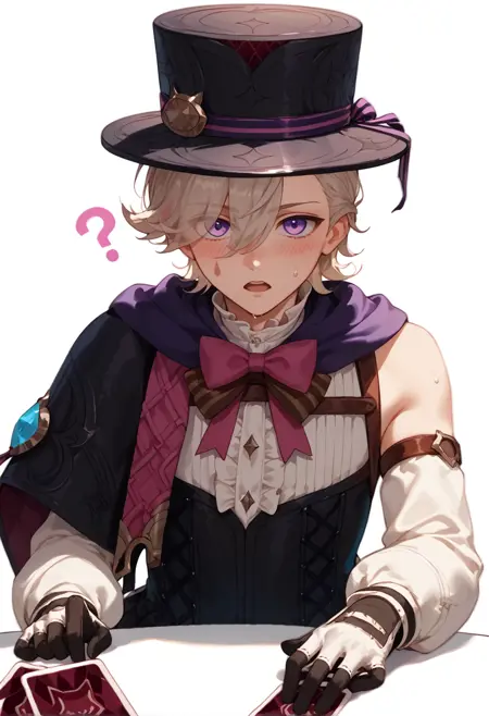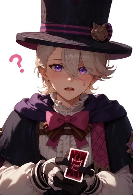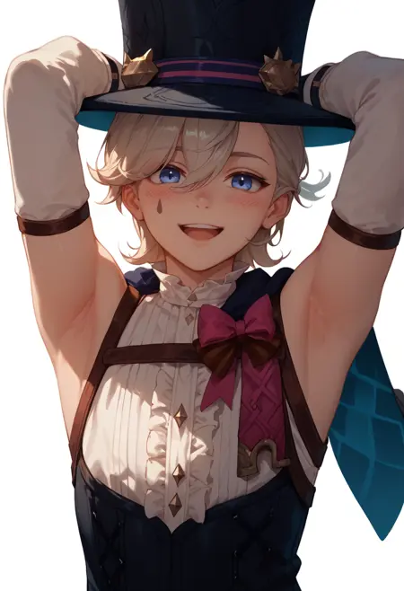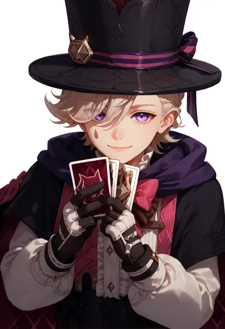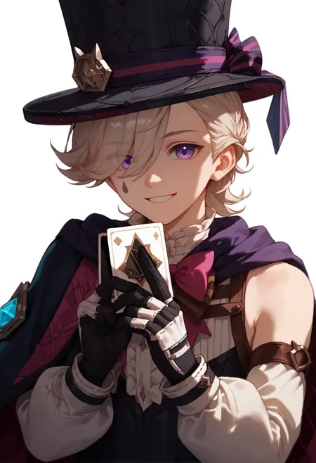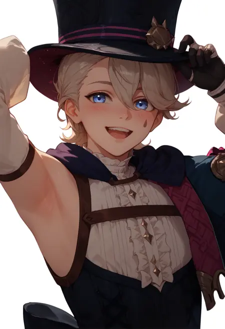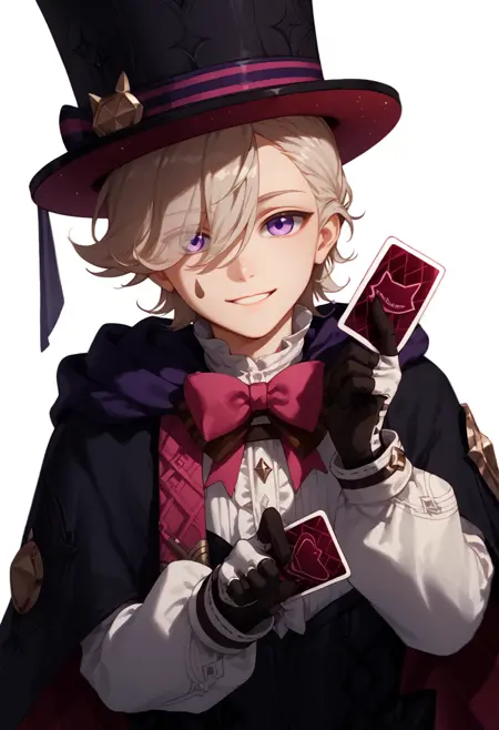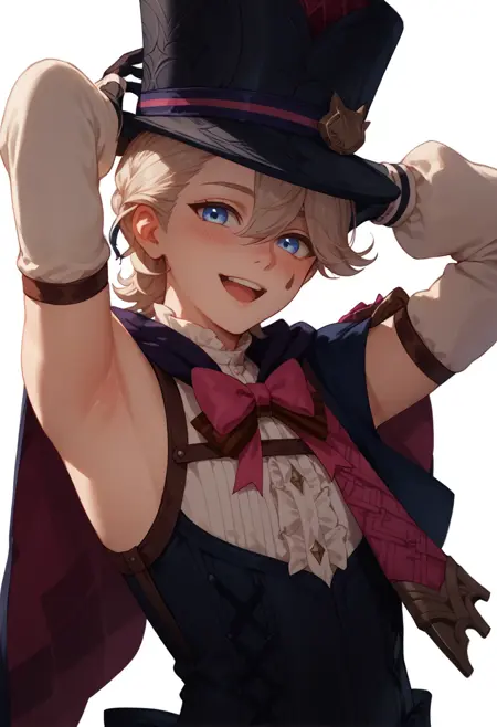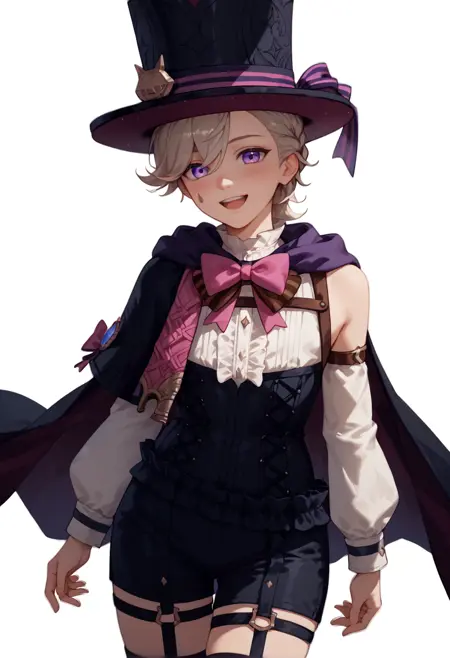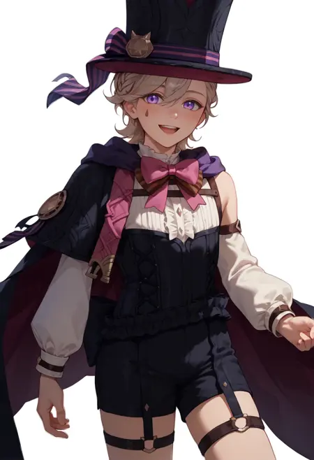 lyney, hat, male focus, 1boy, shorts, braid, solo, cape, top hat, black shorts, detached sleeves, looking at viewer, white background, purple eyes, shirt, white shirt, open mouth, bow, long sleeves, bowtie, simple background, blush, corset, smile