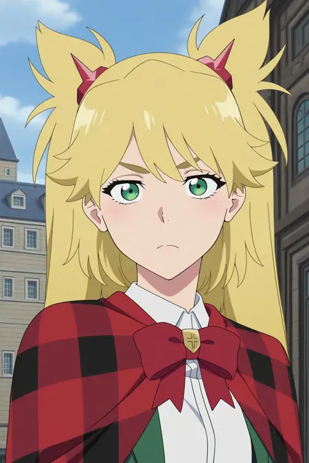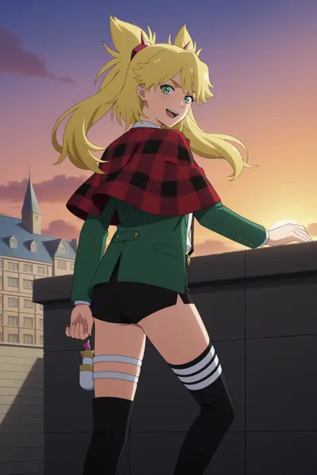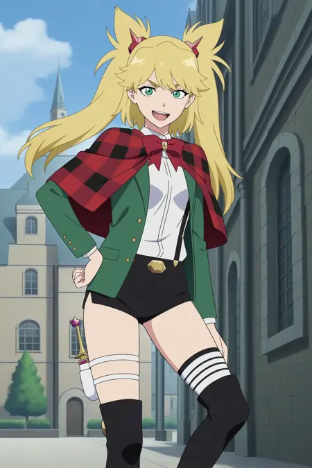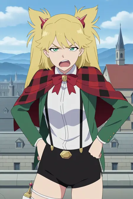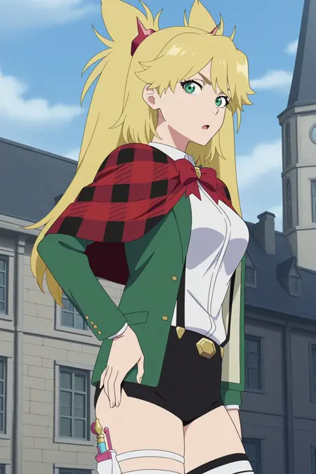 ninny spangcole, ブロンドの髪, 長い髪, 両側を上げた髪型, 髪飾り, 緑の目, 緑のジャケット, 開いたジャケット, 白いシャツ, ルーズシャツ, 赤いボウタイ, 赤いカペレット, チェック柄のカペレット, サスペンダー, 黒いショートパンツ, 短いショートパンツ, 白い太ももホルスター, 黒い靴履き, 太ももブーツ