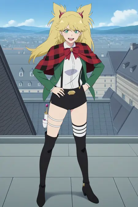 ninny spangcole, blonde hair, long hair, two side up, hair ornament, green eyes, green jacket, open jacket, white shirt, collared shirt, red bowtie, red capelet, plaid capelet, suspenders, black shorts, short shorts, white thigh holster, black footwear, thigh boots