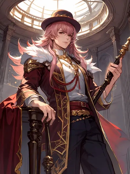 • Yurius (Formal):Pink hair,long hair,yellow eyes,armor,red suit,long sleeves,jacket,cape,ribbon,sash