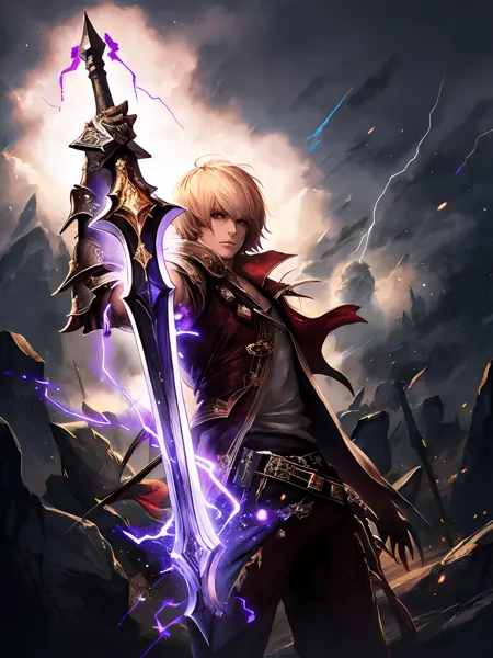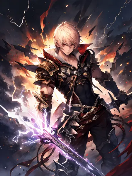 • Albert (Thunderous Doom):Thunderous Doom,blonde hair,short hairmred eyes,black armor,scarf,gloves,purple lightning