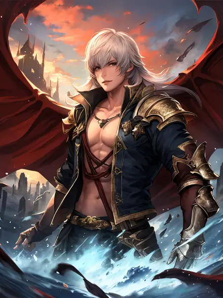 • Yurius (Evil):White hair,long hair,yellow eyes,armor,blue open jacket,muscular,gloves,ribbon