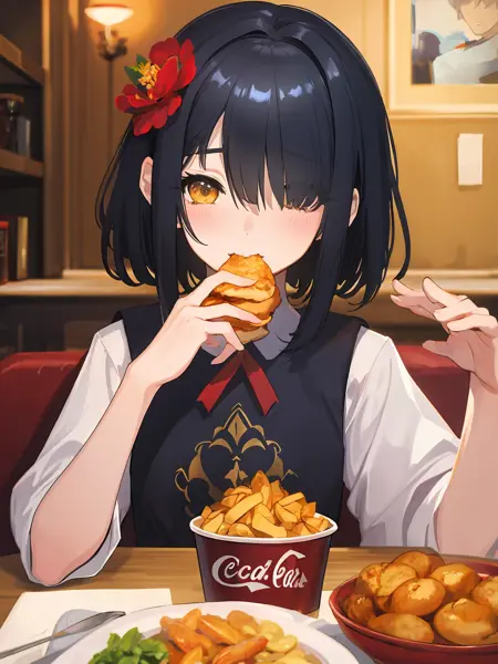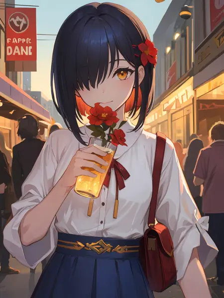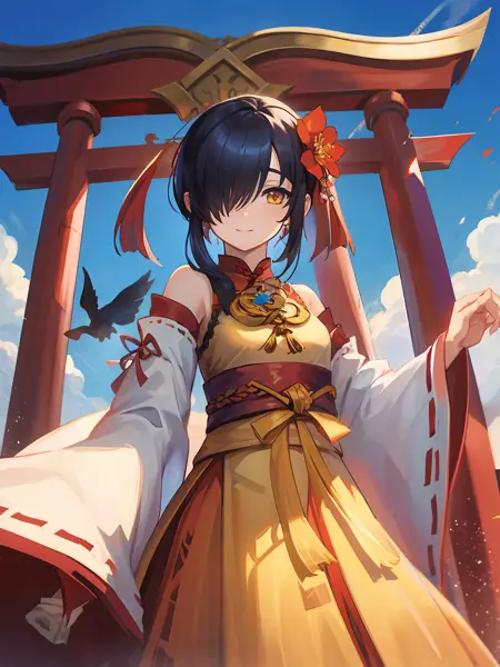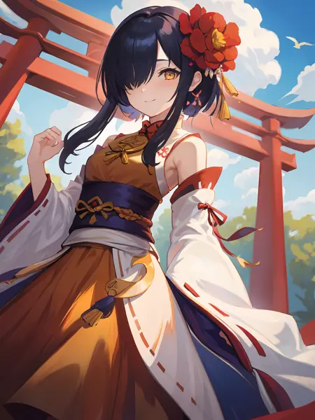 Basic: Black hair,yellow eyes,hair ornament,hair flower,dress(recommend not using color as prompt),miko,obi,detached sleeves,wide sleeves