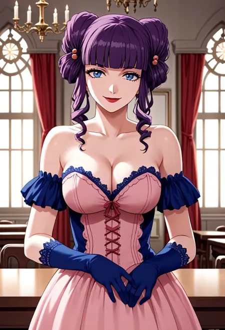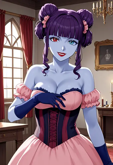 bangs,blunt bangs,drill hair,hair bun,double bun,purple hair,blue eyes,lipstick,
