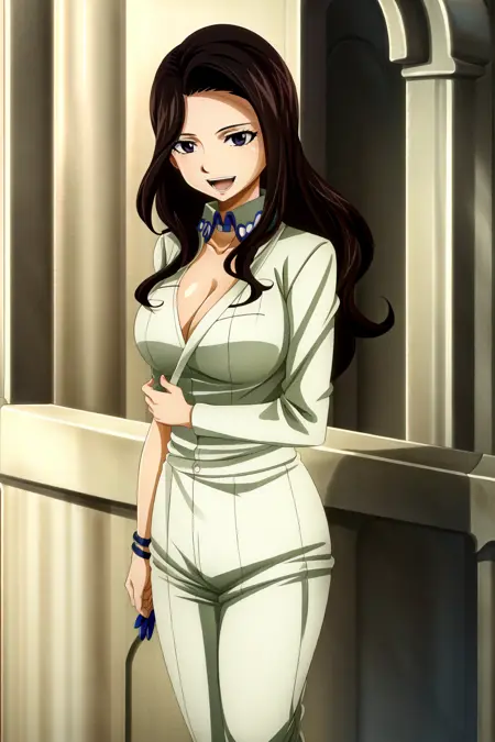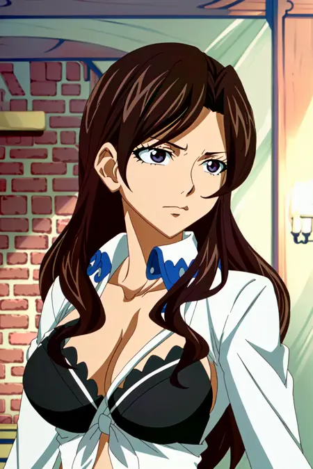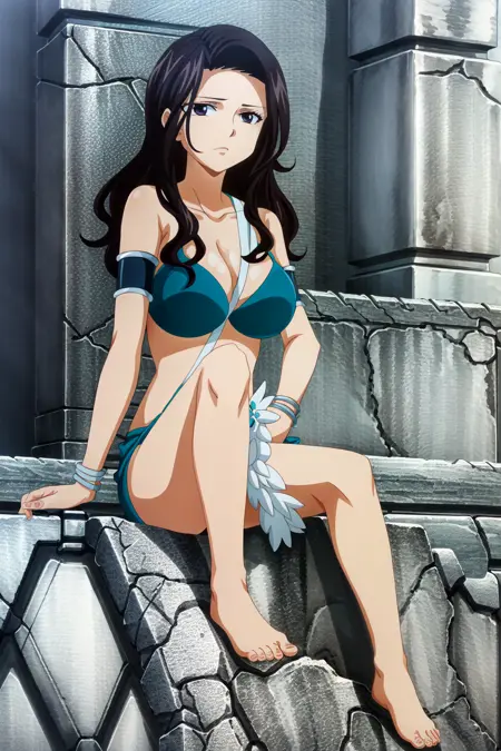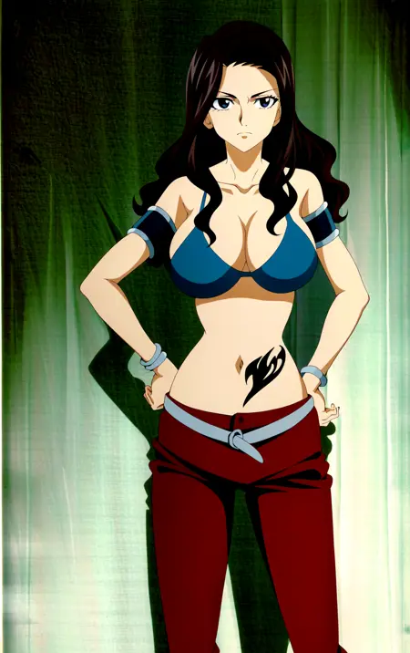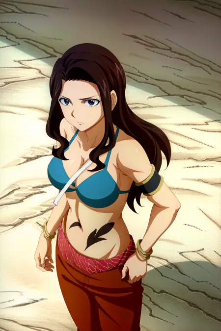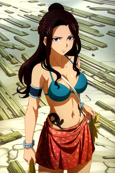 Cana Alberona, 1girl, solo, tattoo, long hair, breasts, brown hair, large breasts, bikini top only, midriff, cleavage, navel, swimsuit, cup, long hair, bracelet, alcohol, jewelry, black hair, barrel, wine glass, wine