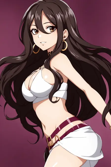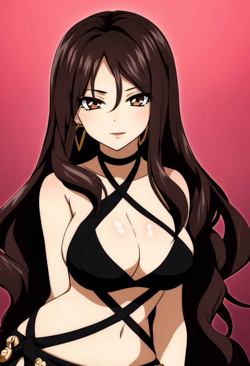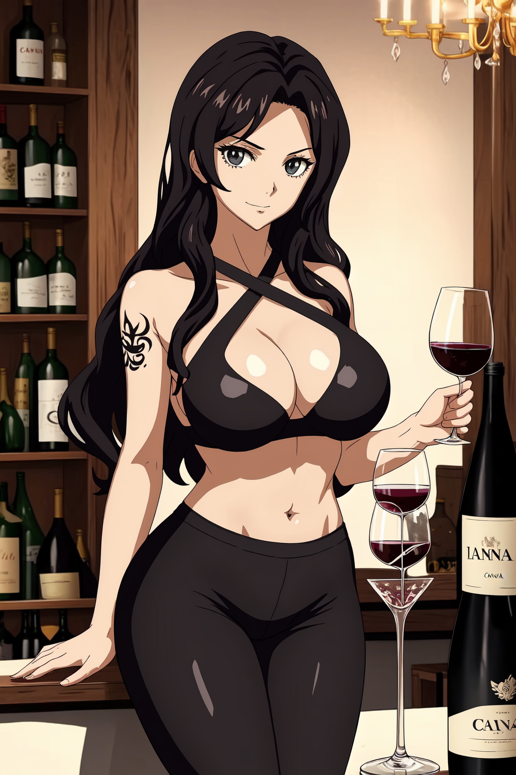 Cana Alberona, 1girl, solo, tattoo, long hair, breasts, brown hair, large breasts, bikini top only, midriff, cleavage, navel, swimsuit, cup, long hair, bracelet, alcohol, jewelry, black hair, barrel, wine glass, wine