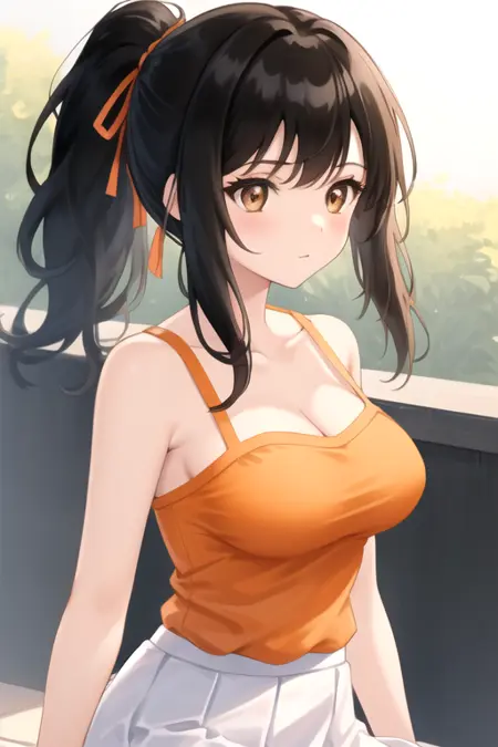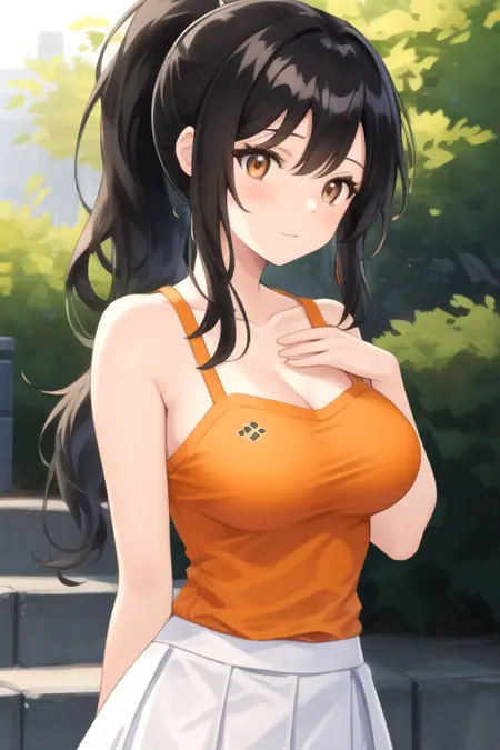 CattleyaGlory, 1girl, solo, long hair, white skirt, large breasts, orange shirt, black hair, bare shoulders, brown eyes, collarbone, ponytail, sleeveless, orange camisole,