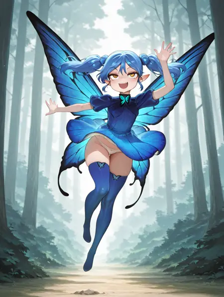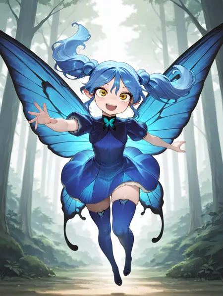 ティタニア、青い髪、ツインテール、黄色い目、フェアリー、蝶の翼、青いドレス、短袖、青い太もも長ズボン