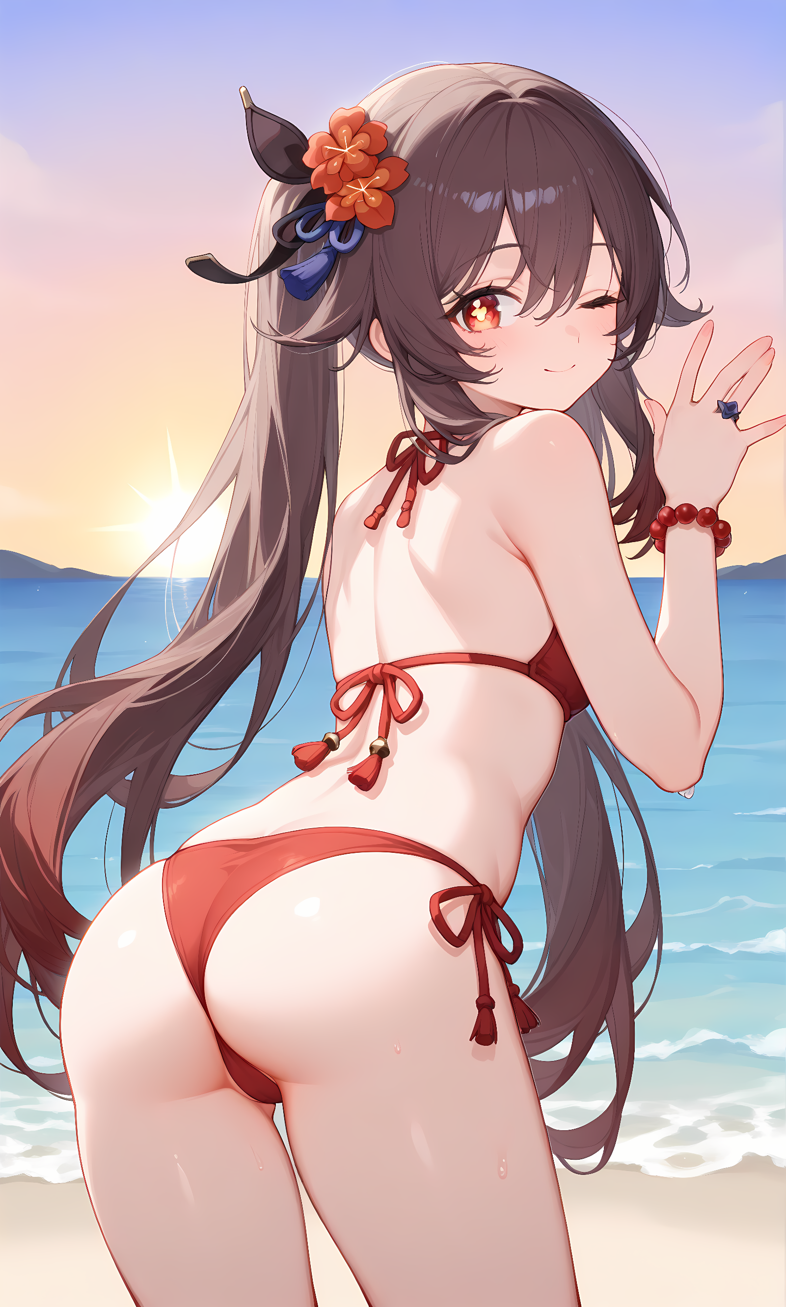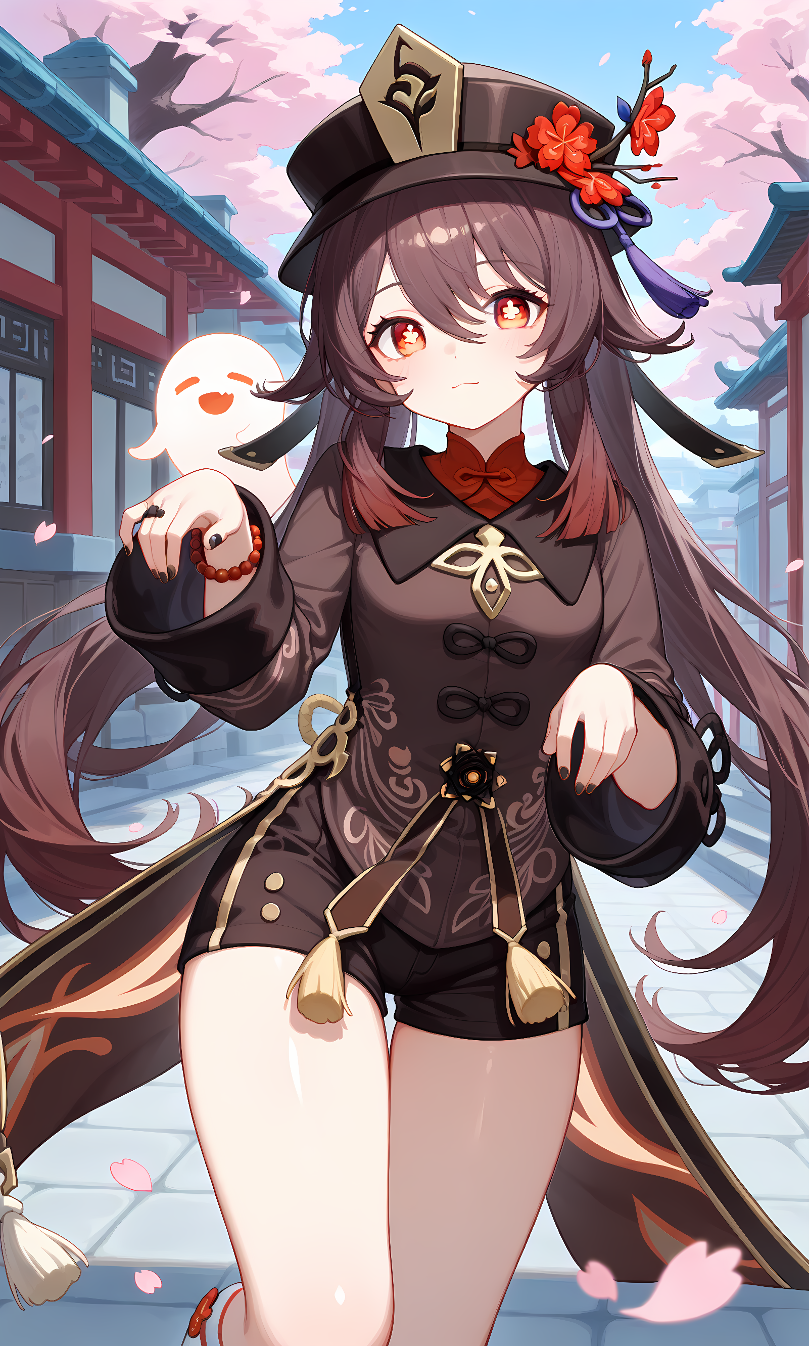 후타오 (젠신 임팩트), 긴 머리, 갈색 머리, 붉은 눈, 기호 모양의 동공, 트윈테일, 꽃 모양의 동공, 매우 긴 머리, 눈 사이의 머리카락