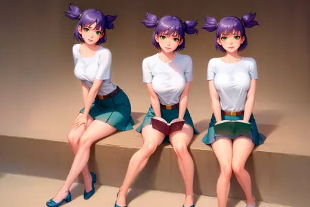 un,短发,两侧上翘,紫色头发,绿色眼睛。