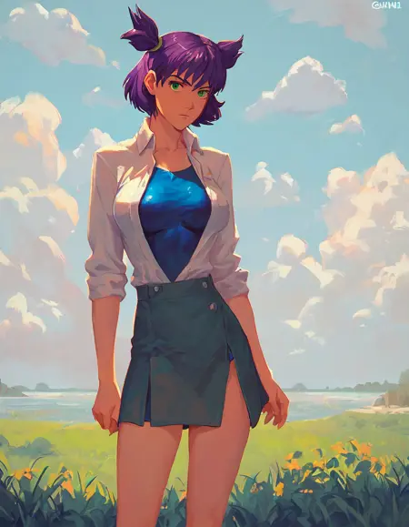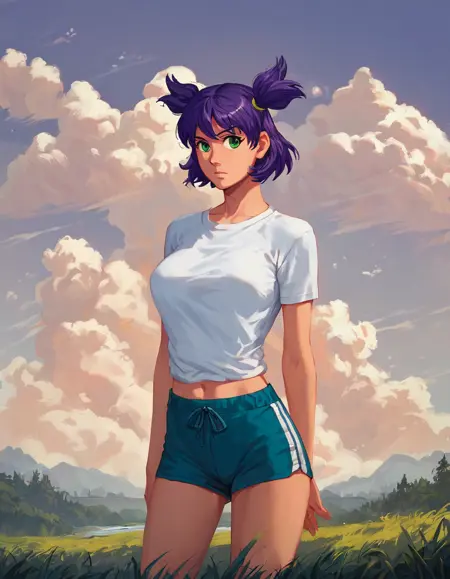 un, 短い髪, 髪の両サイドを上に上げる, 紫の髪, 緑の目