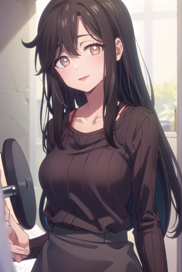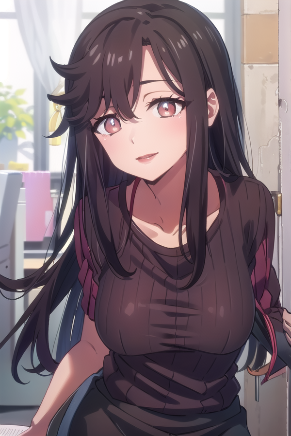 saori ohtori, long hair, black hair, (brown eyes:1.5), smile, lips, lipstick, lips, red lips,