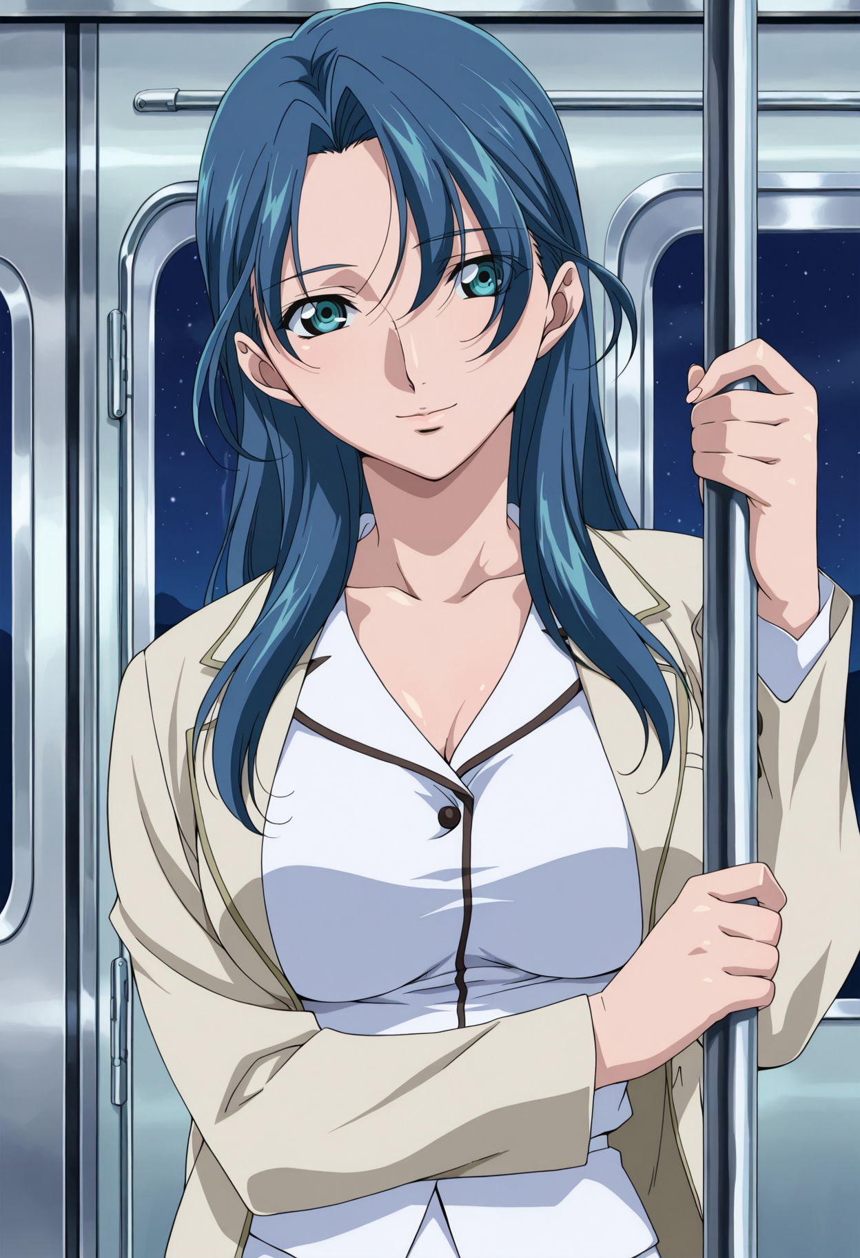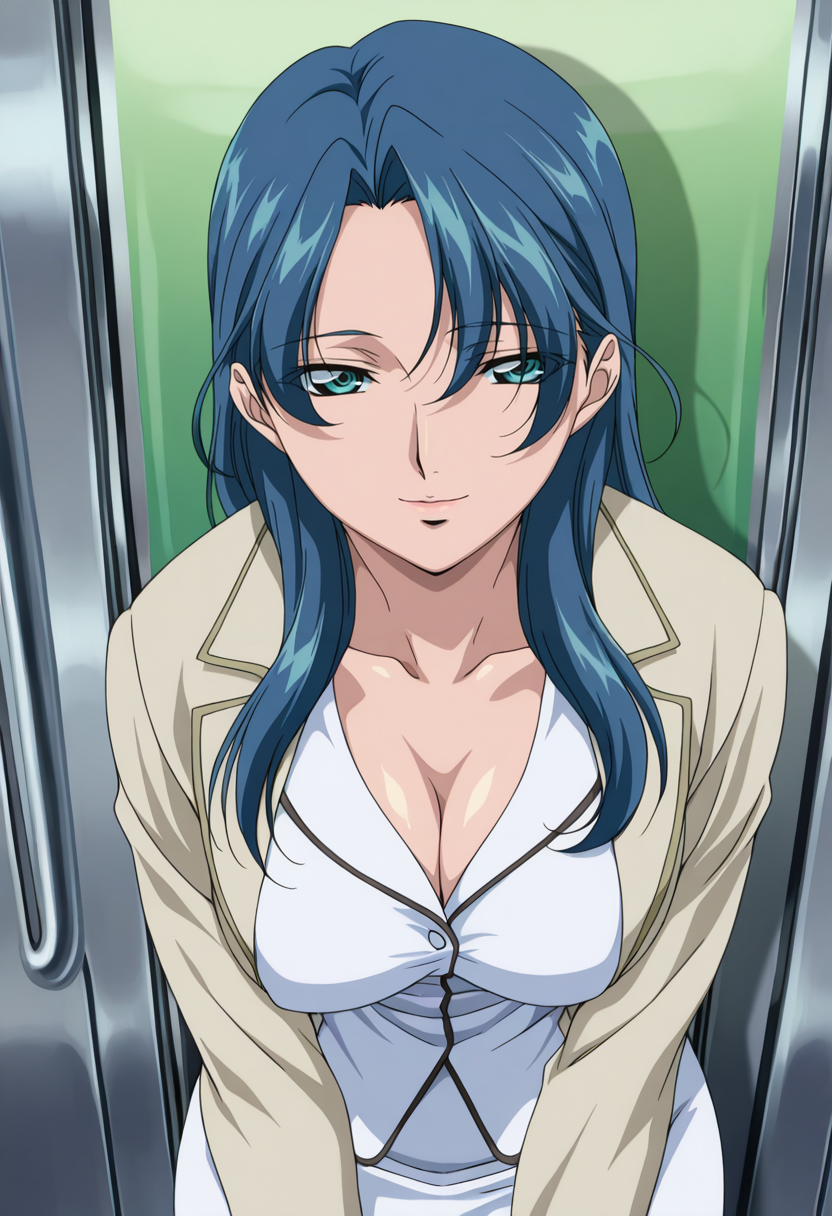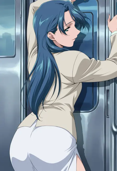 기본: sayaka_i, 1girl, 애니메이션 컬러링, 레트로 아트스타일, 싱글, 긴 머리, 파란 머리, 머리카락 사이로 보이는 눈, 아쿠아 눈, sayaka 스커트 수트, 분홍 재킷, 흰색 셔츠, 긴 소매, 연필 스커트, 흰색 스커트, 열린 재킷, 큰 가슴,