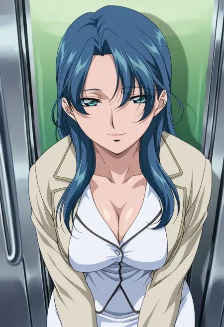 基础:sayaka_i, 1girl, 动漫上色, 复古艺术风格, 单人, 长发, 蓝发, 发丝间可见眼睛, 水蓝色眼睛, sayaka裙装, 粉色夹克, 白色衬衫, 长袖, 铅笔裙, 白色裙子, 开襟夹克, 大乳房,