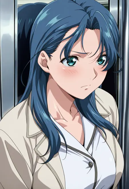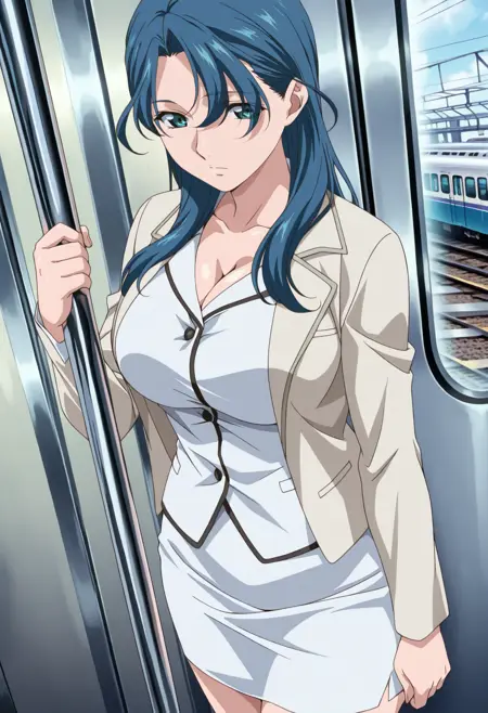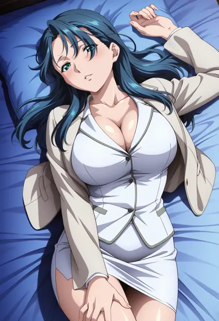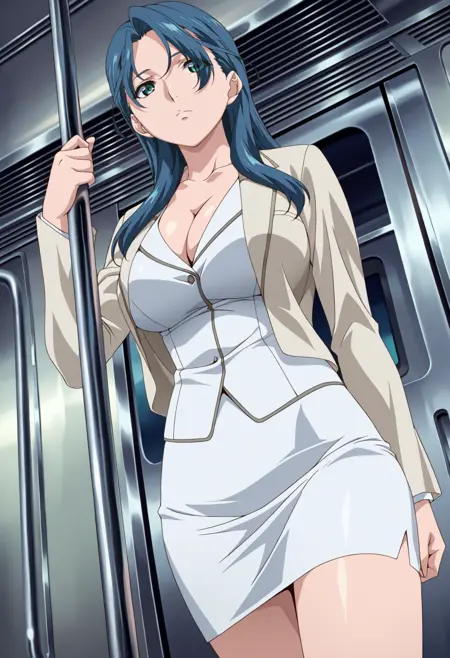 Base: sayaka_i, 1girl, anime coloring, retro artstyle, solo, long hair, blue hair, eyes visible through hair, aqua eyes, sayaka skirt suit, pink jacket, white shirt, long sleeves, pencil skirt, white skirt, open jacket, large breasts,