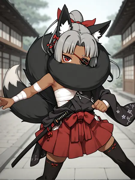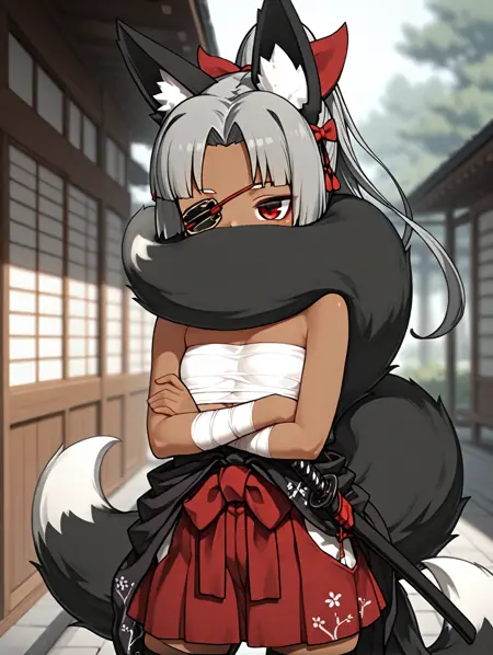 伊兹娜,灰发,高马尾,红眼,黑色狐狸耳朵,黑色狐狸尾巴,四尾,深色皮肤,眼罩,绷带,裹胸布,红裙,发带,红色蝴蝶结,尾巴遮住嘴巴,嘴巴被遮盖,尾巴环绕头部,黑色过膝袜,