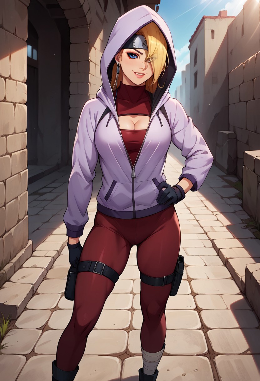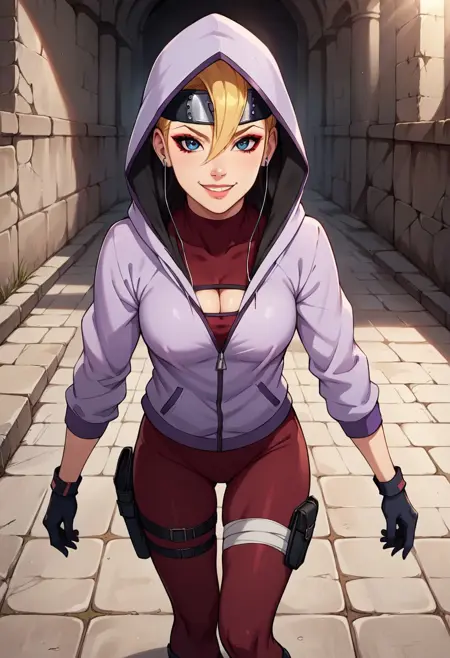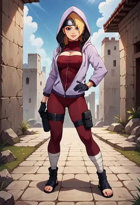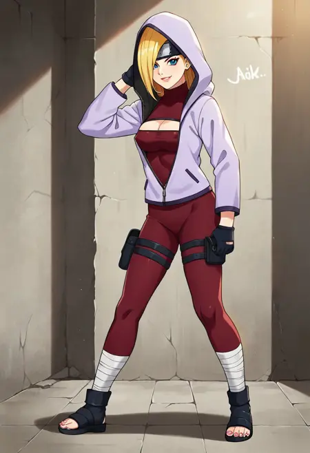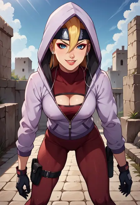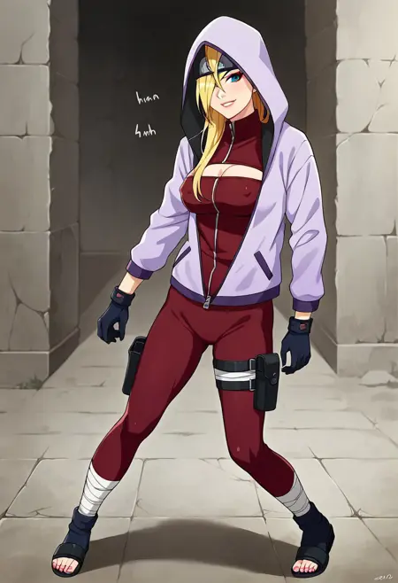 YodoBNNG, 1girl, ソロ, 皮膚が白い少女, 金髪, 長い髪, 乱れた髪, 髪が目の間にある, 片方の目に髪がかかる, 大きな前髪, 額の保護具, 濃い青い目, 唇, 大きな胸, 胸元の切り抜き, 衣服の切り抜き, フード, フーディー, ジャケット, 半分ジッパーが開いた薄紫色のジャケット, 濃い赤色の全身スーツ, 黒い手袋, サンダル, 足先が開いた履物, イアホン, 足首に包帯, 右太ももに包帯, メイク, 太ももポーチ,