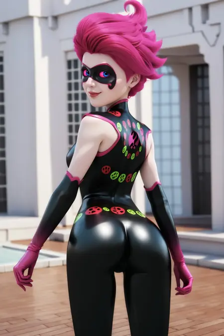 Miraculer 프롬프트: 1girl, bodysuit, pink hair, domino mask, blue eyes, colored sclera, pink sclera, skin tight, elbow gloves, sleevesless, short hair