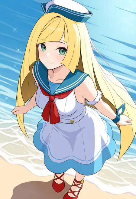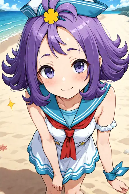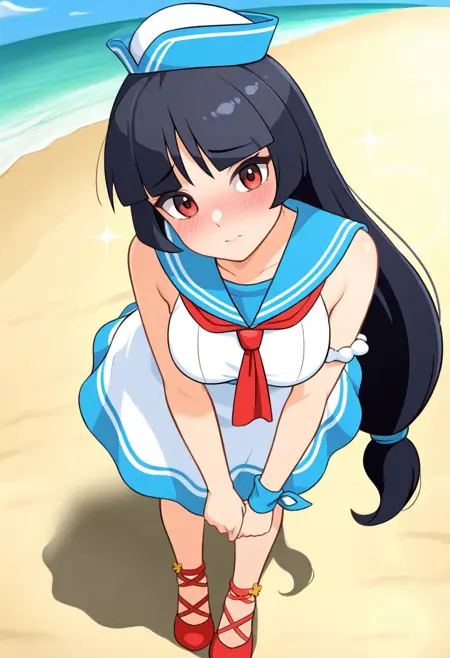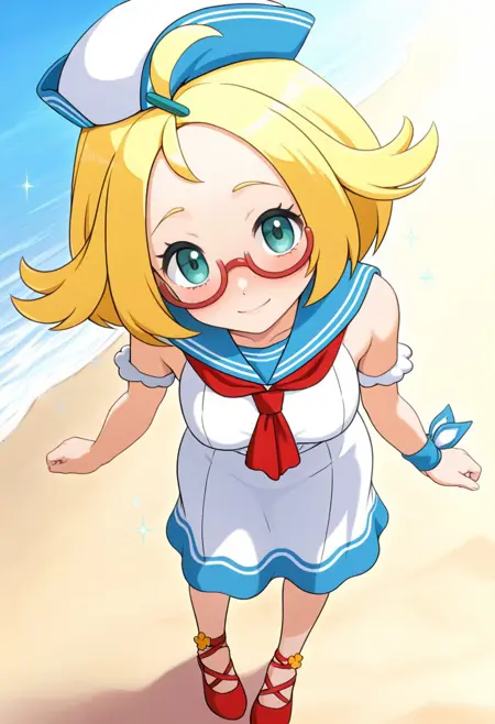 ヘアクリップ、帽子、白い頭部装飾、青い頭部装飾、ノースリーブドレス、白いドレス、青いドレス、セーラー襟、赤いネクチーフ、腕輪、片腕のリストバンド、リストリボン、靴、フラットシューズ、赤い足元