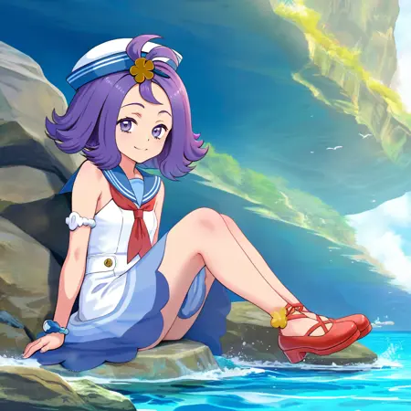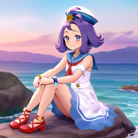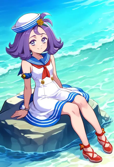 发夹、帽子、白色头饰、蓝色头饰、无袖连衣裙、白色连衣裙、蓝色连衣裙、水手领、红色领巾、臂环、单腕带、腕部丝带、鞋子、平底鞋、红色鞋履