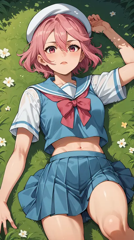 短发,粉发,头发遮住眼睛,粉眼,校服,蓝色西装外套,白色领子,有领衬衫,红色蝴蝶结,百褶裙,紫色裙子