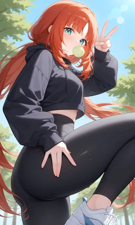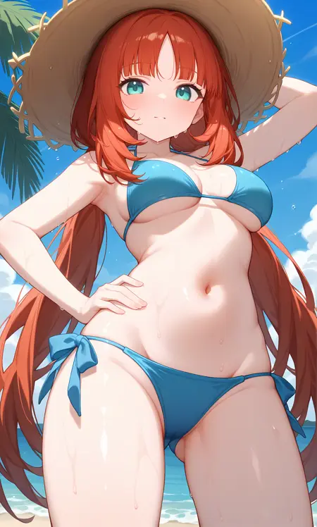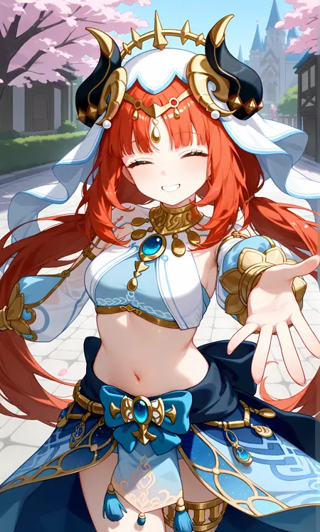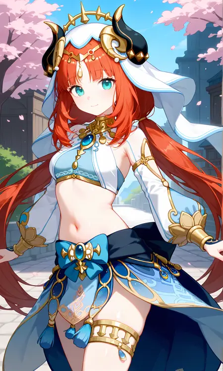 ニルー(原神)、長い髪、赤髪、分け目のある前髪、青緑色の目、低めのツインテール、非常に長い髪、サイドロックス