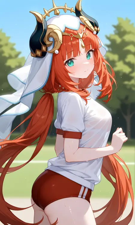 nilou (genshin impact), long hair, red hair, parted bangs, aqua eyes, low twintails, very long hair, sidelocks