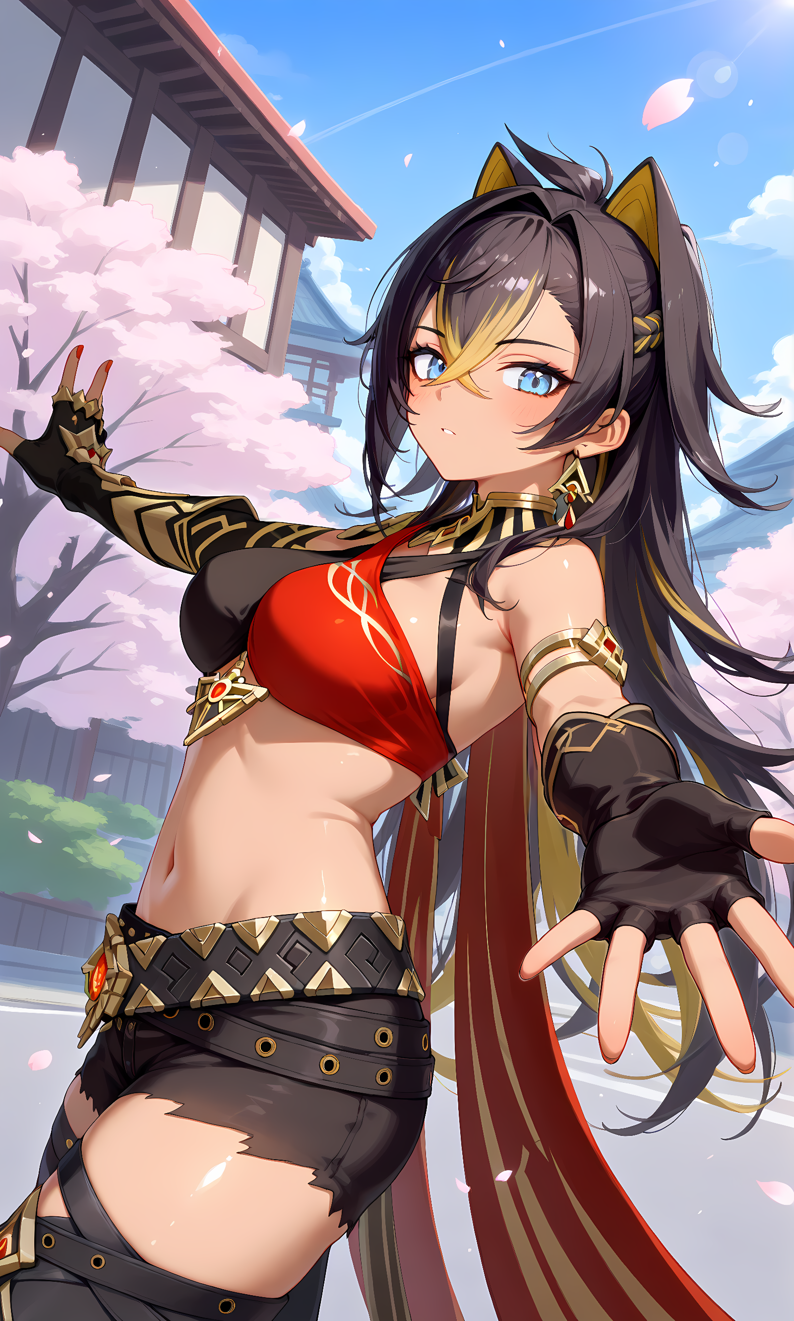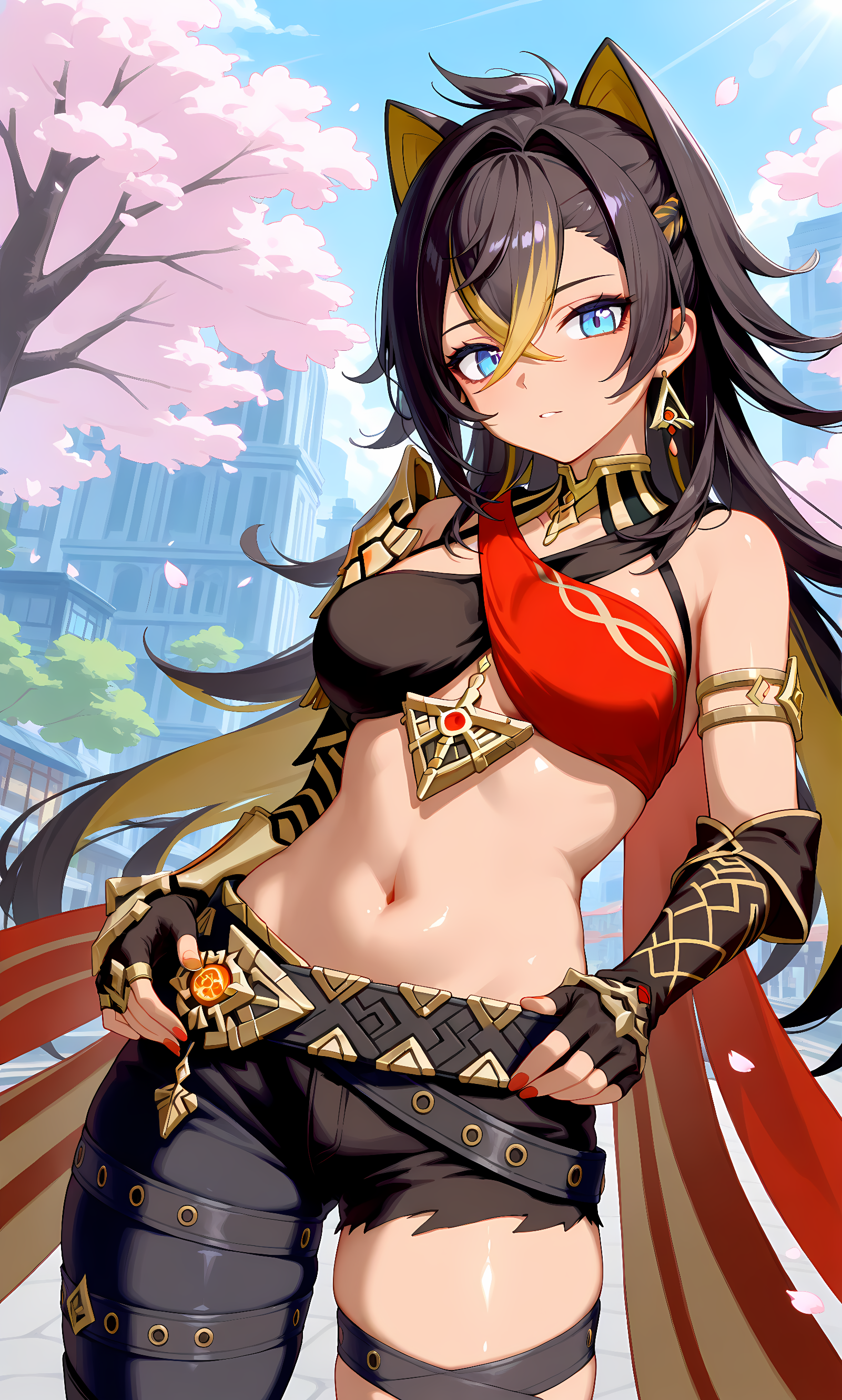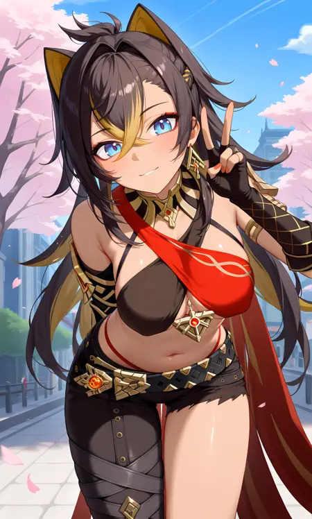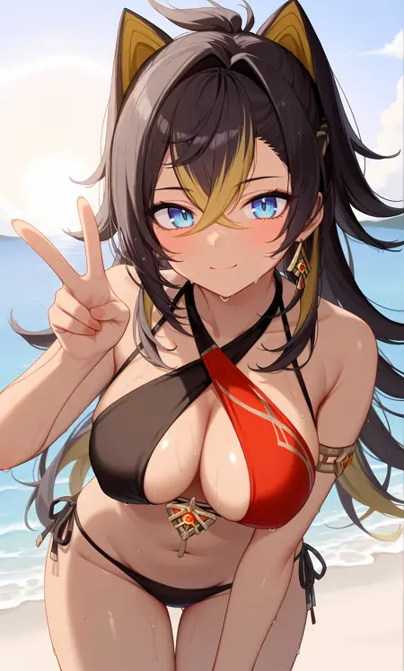 デヒヤ (原神)、複色の髪、ストライプ模様の髪、長い髪、青い目、黒髪、金髪、濃い肌、交差した前髪、イヤリング、動物の耳