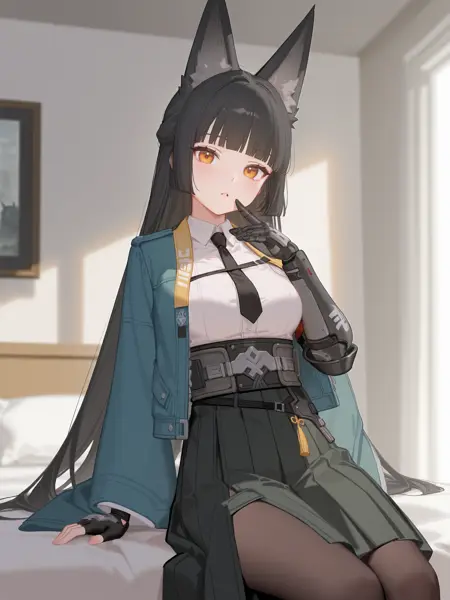 彼女のゲーム内デフォルト衣装用の追加プロンプト:黒いパンスト、袴短スカート、指なし手袋、白いシャツ、アクア色のジャケット、片方の機械の腕、袖から腕が飛び出ている、黒いネクタイ、踝ブーツ、アンクレット
