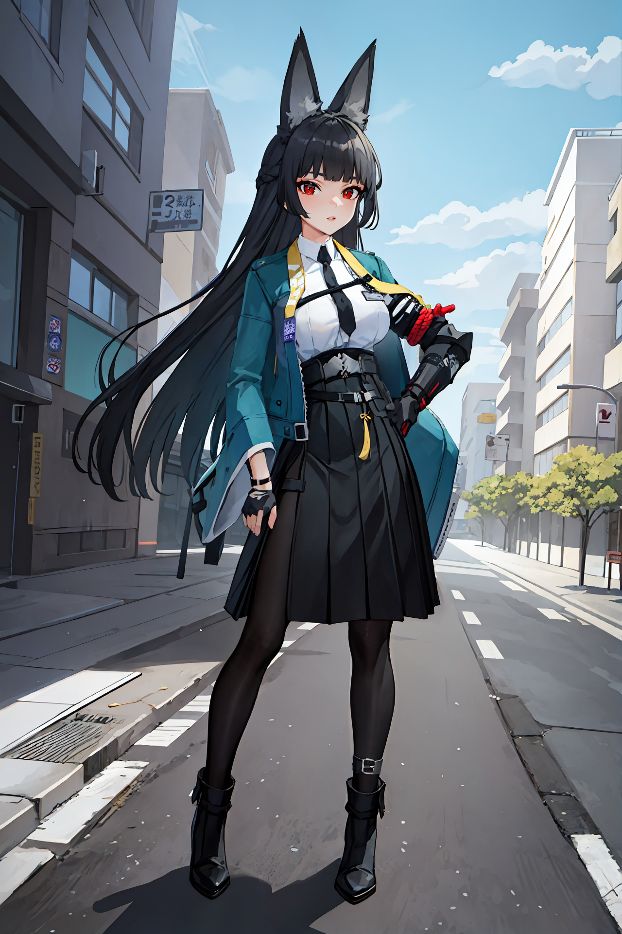 Additional prompts for her default in-game costume: black pantyhose, hakama short skirt, fingerless gloves, white collared shirt, aqua jacket, single mechanical arm, arm out of sleeve, black necktie, ankle boots, anklet
