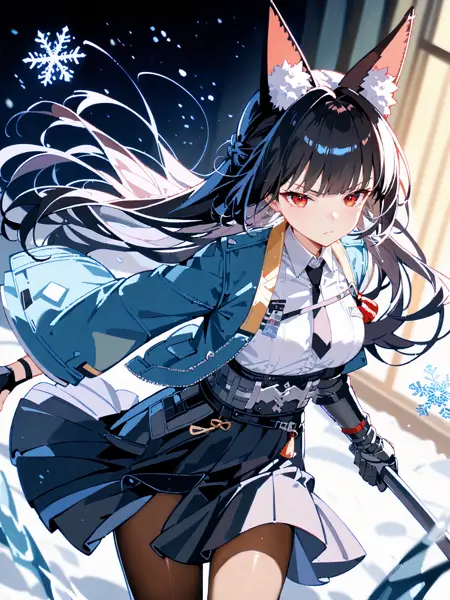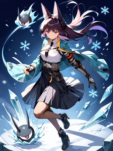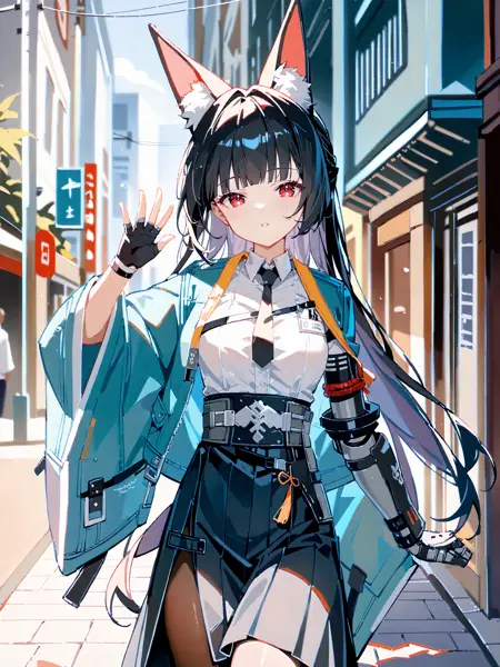 Additional prompts for her default in-game costume: black pantyhose, hakama short skirt, fingerless gloves, white collared shirt, aqua jacket, single mechanical arm, arm out of sleeve, black necktie, ankle boots, anklet