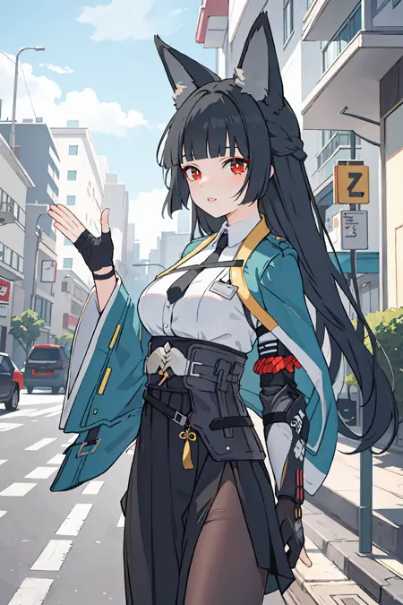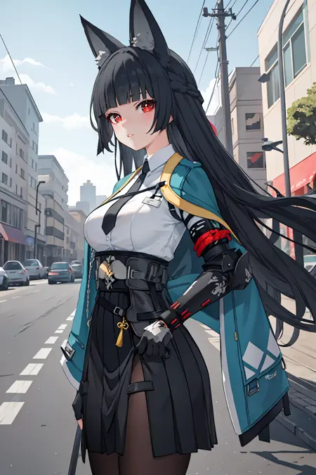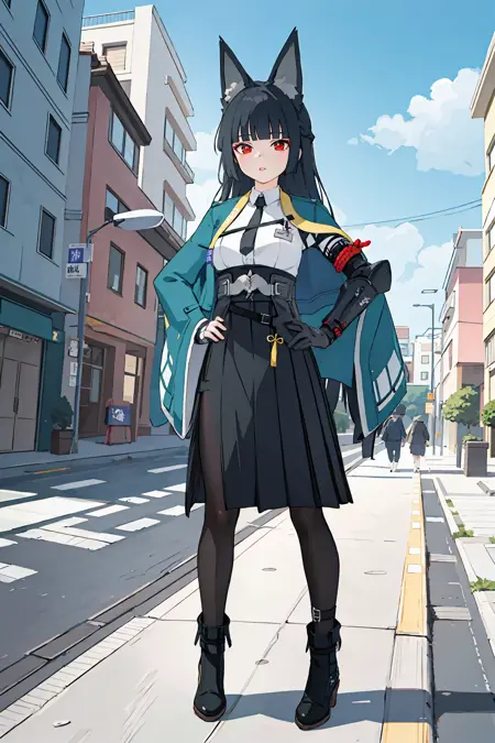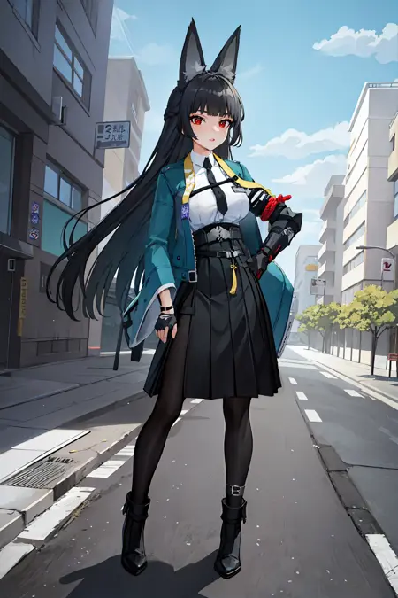 彼女のゲーム内デフォルト衣装用の追加プロンプト:黒いパンスト、袴短スカート、指なし手袋、白いシャツ、アクア色のジャケット、片方の機械の腕、袖から腕が飛び出ている、黒いネクタイ、踝ブーツ、アンクレット