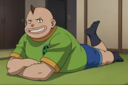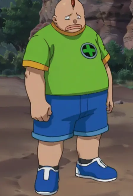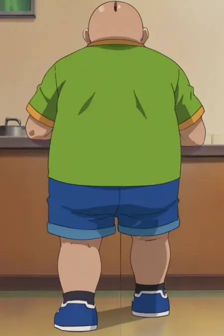 프롬프트: 남성, 비만, 갈색 머리, 대머리, 회색 눈, 녹색 티셔츠, 녹색 프린트 셔츠, 파란색 반바지, 검은 양말, 파란색 신발, 실내(카레 식당/경기장/당좌점), 야외(협곡)
