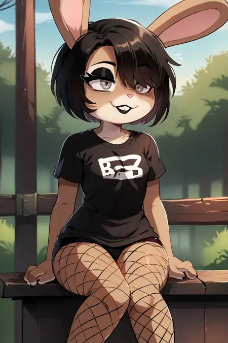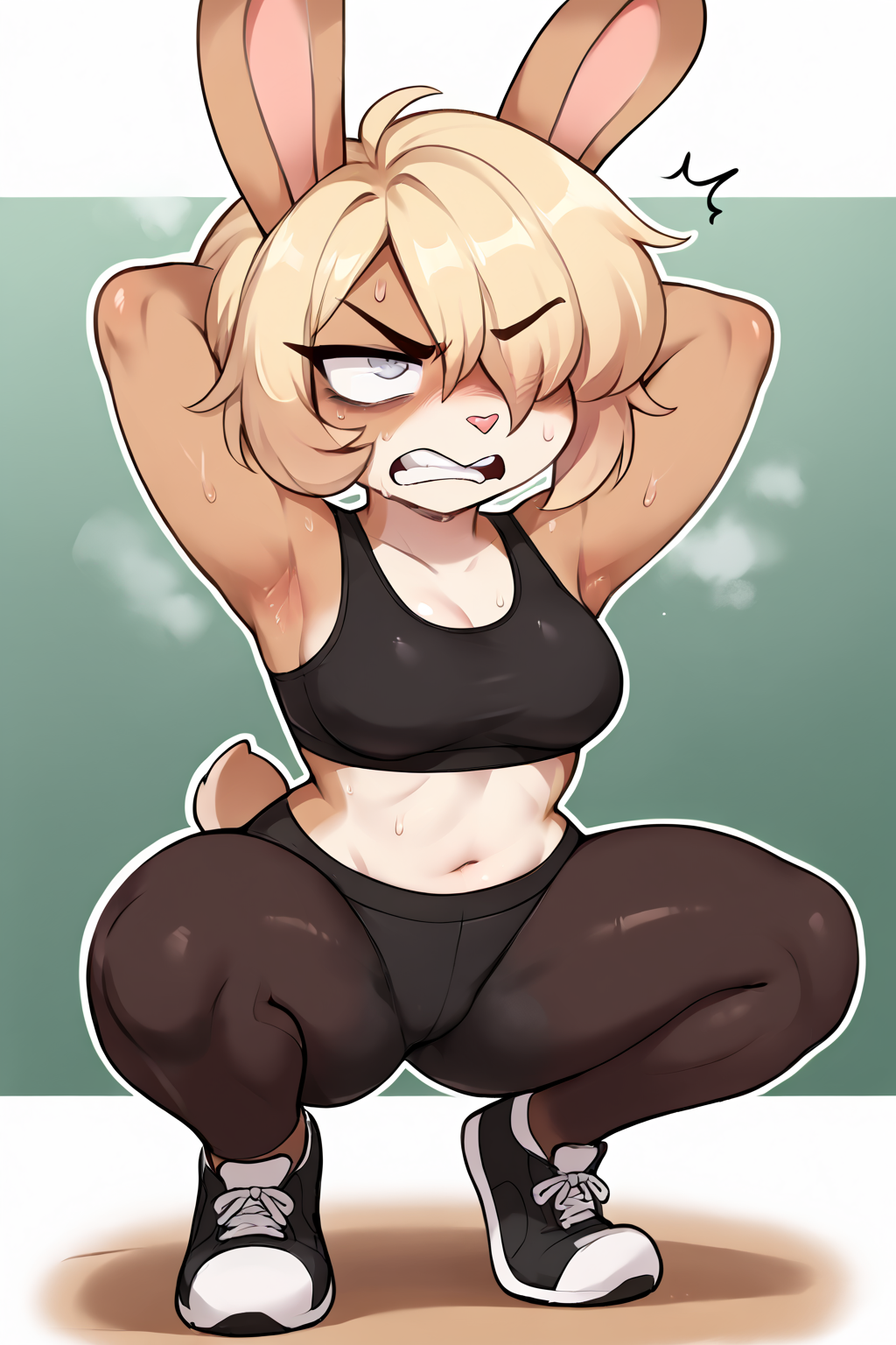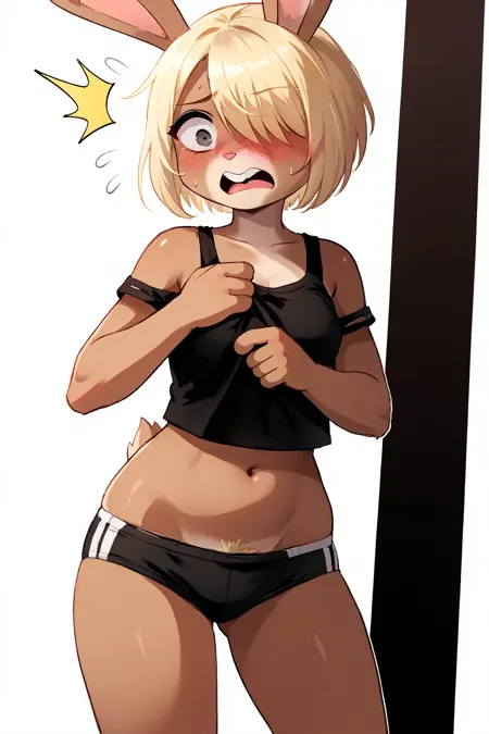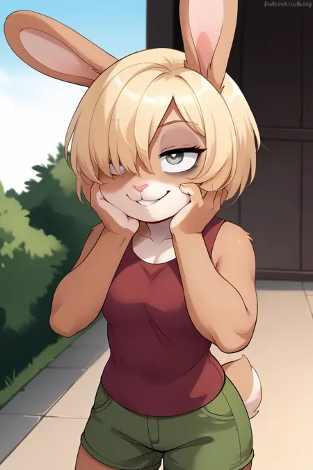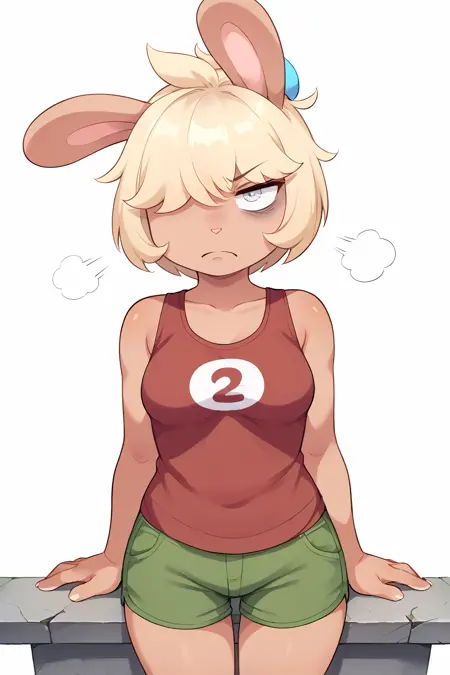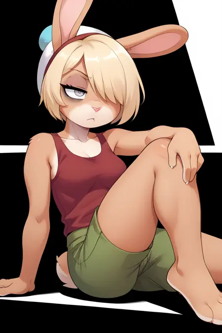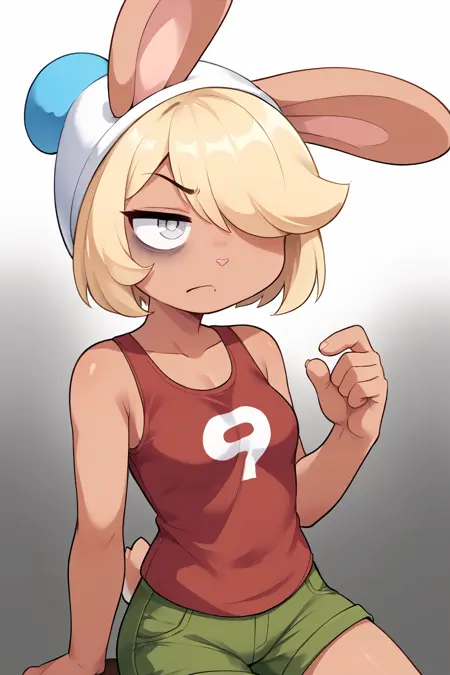 Triggers: lagomorph, anthro, blonde hair, tan body, brown fur, short hair, hair over eye, grey eye, red tanktop, green shorts, white beanie, bored expression, eye bags