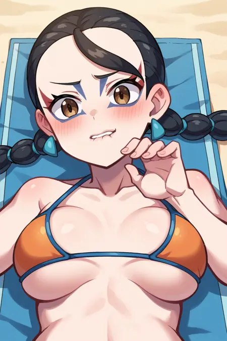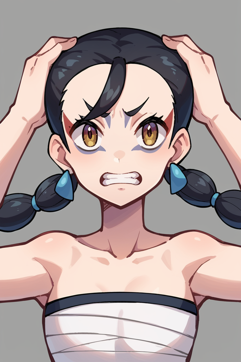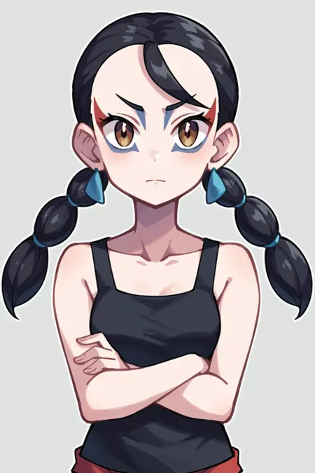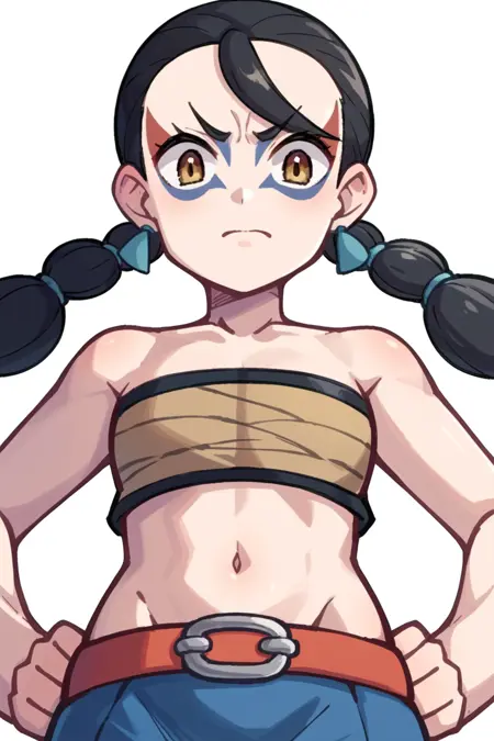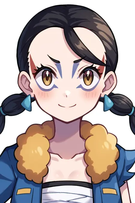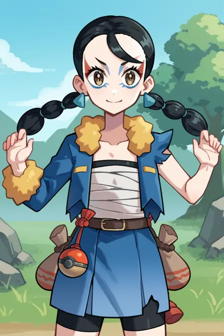 キーワードは clov3r で、デフォルトの服装には:フェイスペイント、ツインテール、イヤリング、ファートリム、笹巻き、破れたジャケット、破れた袖、青いスカート、破れたスカート、黒いショーツ、ベルト、ポケボール、タッセル、ポーチ、黒い靴を使用してください。