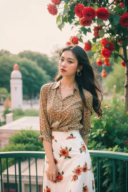 港風のプロンプト参考:HongKong style, blurry, black eyes, red lips, closed eyes, dress, sitting, lipstick, blurry background, hairband, denim, photo background, makeup, jacket, smile, red dress, floral print, sunglasses, print shirt, nail polish, multicolored clothes, hawaiian shirt
