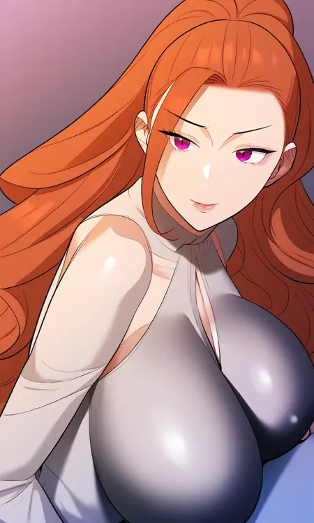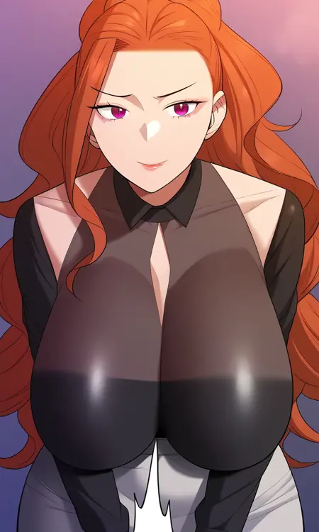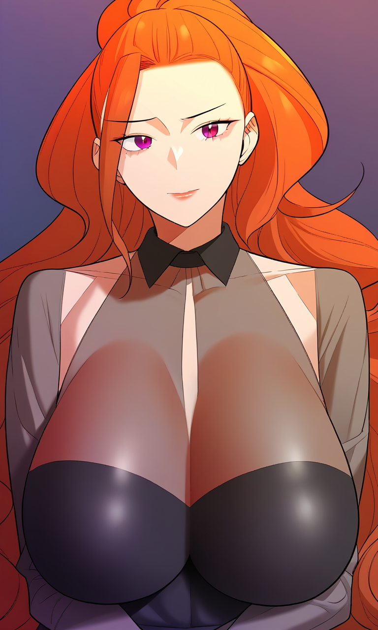 kwonmiri, large breasts, orange hair, long hair, purple eyes