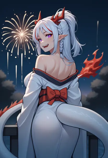 默认服装: n1andef, 渐变皮肤, 红色皮肤, 龙尾, 腿部纹身, 长发, 条纹发, 白发, 红发, 马尾, 半扎发, 编发, 红色角, 龙角, 尖耳, 紫色眼睛, 白色外套, 开襟外套, 长袖, 宽袖, 红色胸衣, 白色短裤, 短裤, 黑色腰带, 流苏耳环, 珠子手镯, 腹部, 肚脐