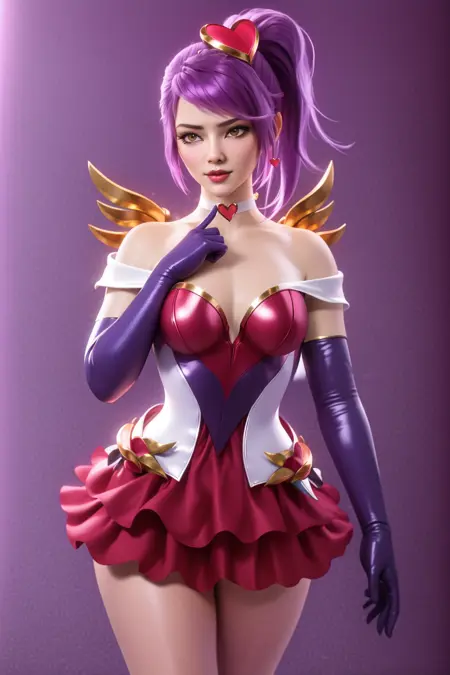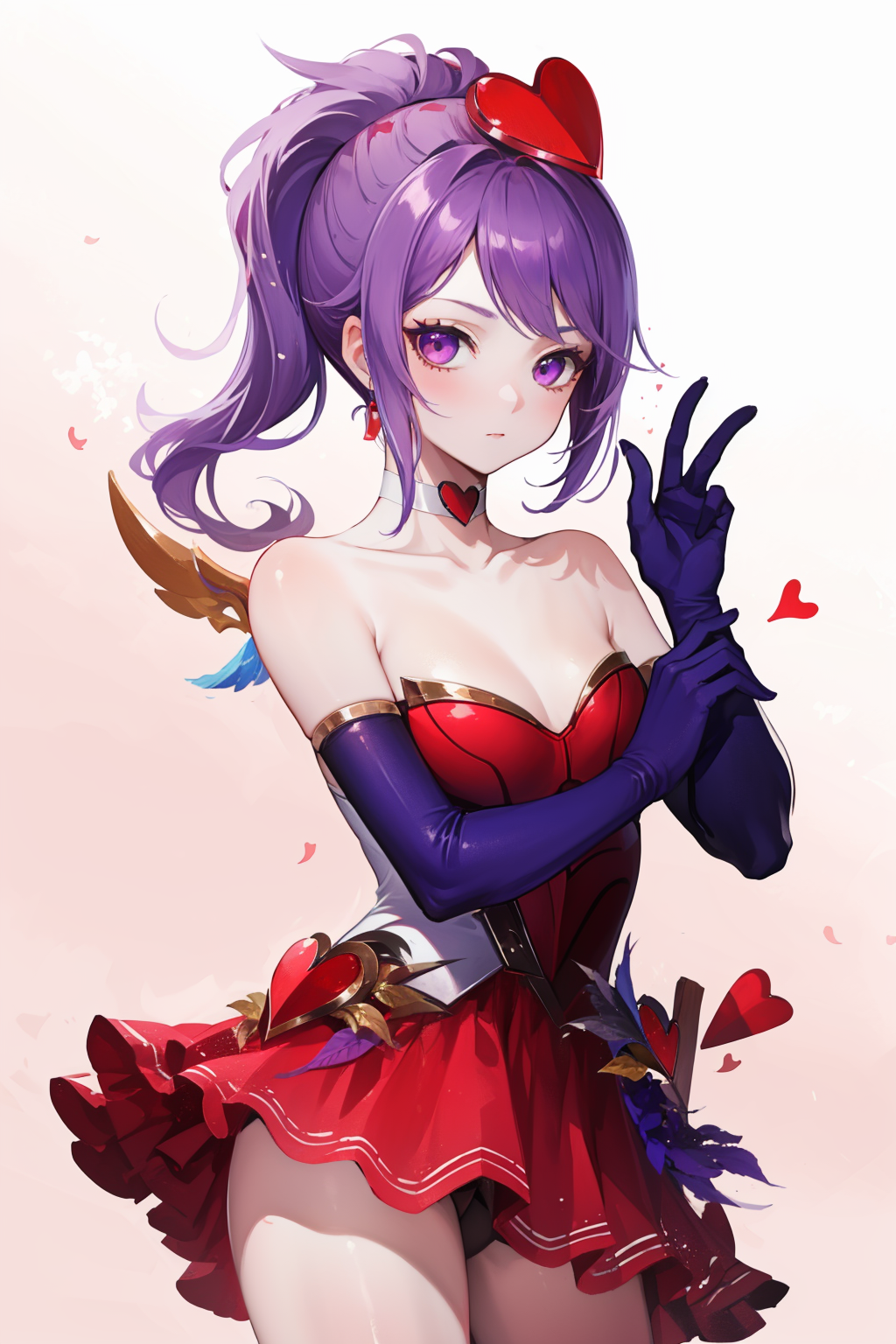 Heartseeker Quinn: heartseeker quinn, 1girl, hair ornament, elbow gloves, dress, ponytail, purple hair, bare shoulders, choker, skirt