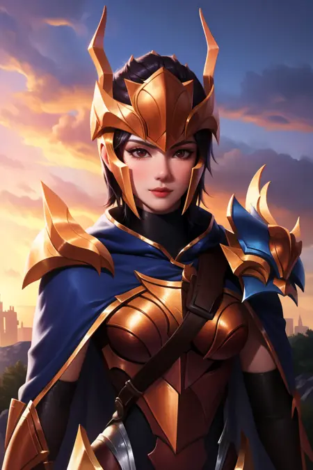 기본 Quinn: quinn \(league of legends\), 1girl, armor, helmet, cape, breastplate, black hair, short hair