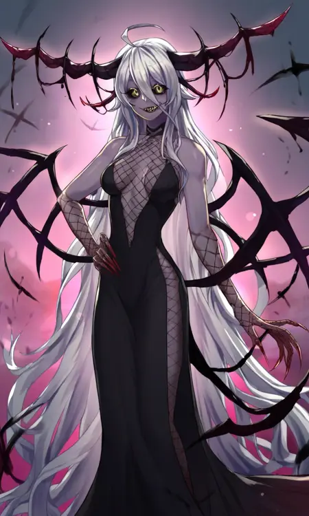 トリガー単語: 欲望の花、黒い虹彩、一人、長い髪、色付きの虹彩、角、黒い角、灰色の肌、悪魔の少女、非常に長い髪、悪魔の角、モンスターガール、ホラー(テーマ)、暗い、笑顔、爪、白い髪、黒い角、灰色の肌、