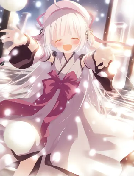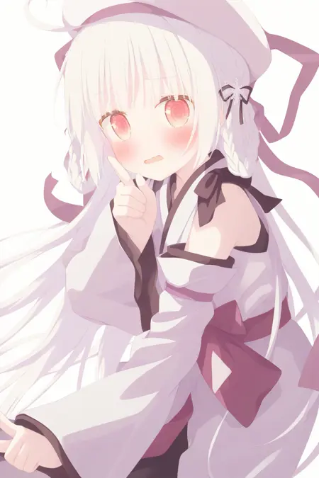 1girl,solo, hat, blush, smile, ahoge, detached sleeves, japanese clothes, hair rings, yuuki\(AstralAir no Shiroki Towa\), white hair