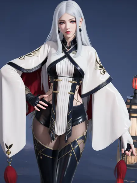 - YJWJjiyingyingWCBF, 1girl, solo, long hair, fingerless gloves, blue eyes, lips, looking at viewer, white hair, breasts, capelet, dress, pantyhose, leather pants, thigh boots, cityscape, night,