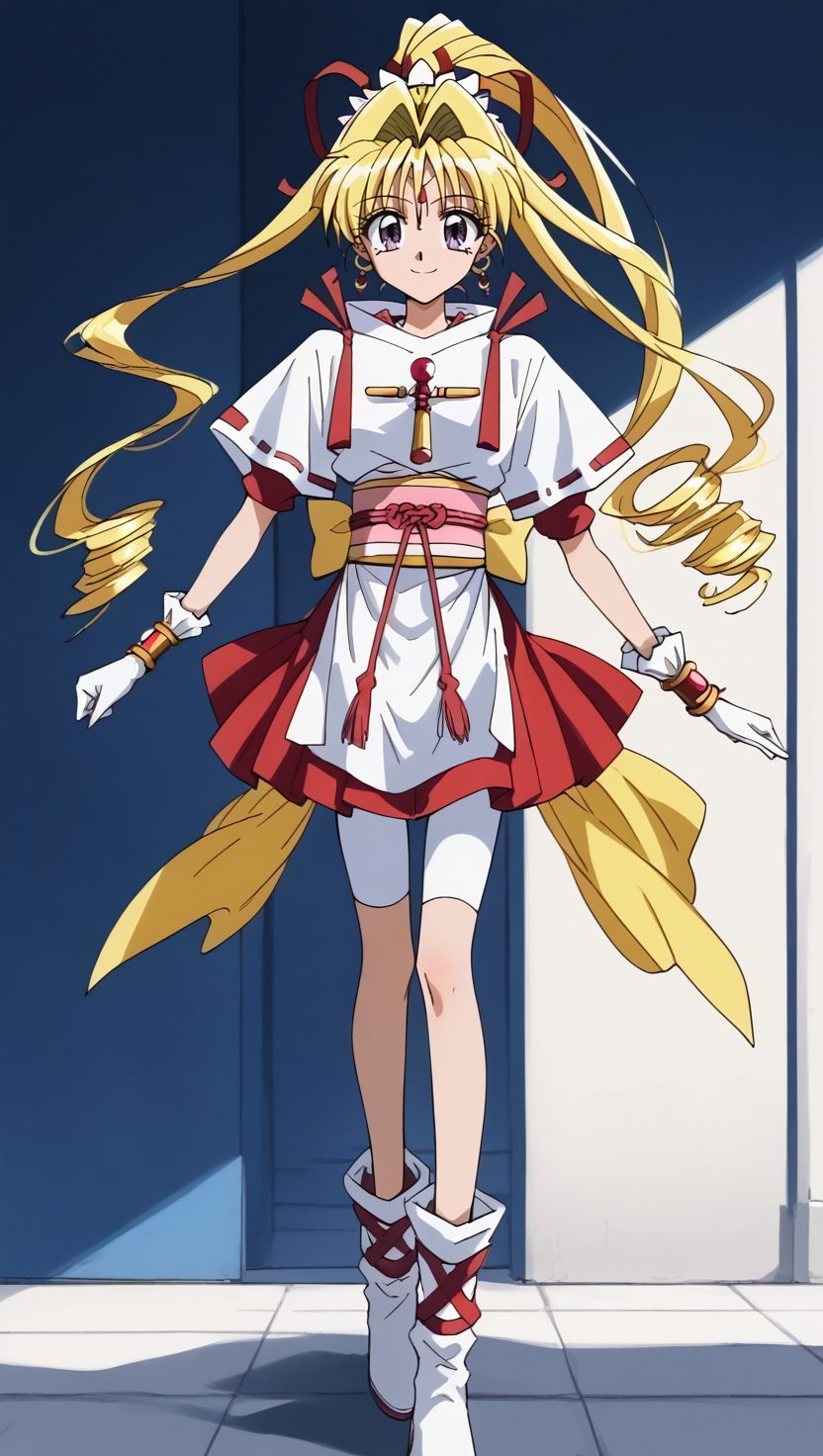 일반 복장: KKJs2, 아티스트 A 스타일, 보라색 눈, 이마 장신구, 금발 머리, 매우 긴 머리, 드릴로 만든 긴 측면 머리카락, 뒤쪽에 한 개의 높은 드릴 페니테일, 흰색 팔각형 장식이 있는 빨간 머리 리본, 귀걸이, 흰색 경계선이 있는 빨간 안쪽 옷, 흰색 복장, 접힌 세로 칼라, 흰색 칼라, 흰색 옆 슬릿과 긴 셔츠 꼬리, 흰색 짧은 소매에 빨간 액센트, 짧은 빨간 안쪽 소매, 노출된 팔 아래부분, 어깨 장식, 어깨에 빨간 리본 장식, 가슴에 십자가 장식, 금팔찌, 긴 흰장갑, 빨간 및 노랑 띠, 다리미 달린 빨간 로프, 큰 노랑 bows, 빨간 계층적 미니스커트, 흰색 자전거 반바지, 허벅지 커버, 자전거 반바지와 부츠 사이의 노출된 허벅지, 흰색 부츠, 부츠를 감싸는 빨간 십자형 리본