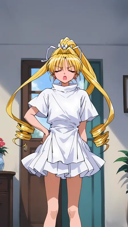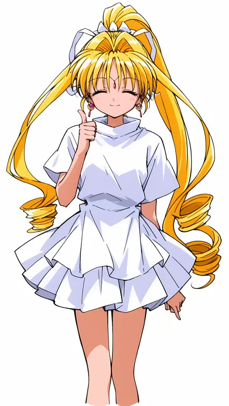 变形服装1:KKJs2,艺术家A风格,紫色眼睛,额饰,金色头发,非常长的头发,头发两侧有钻饰长鬓发,后脑勺一个高钻马尾,白色发带,耳饰,纯白色服装,折叠立领,白色衣领,无肩部装饰,无肩部红色丝带装饰,宽松腰身,无红黄腰带,无带流苏红绳,无后背大黄色蝴蝶结,白色侧开衩与长衣摆,白色短袖,无白色短袖红色装饰,无短红色内袖,胸前十字饰物,裸露双手,白色分层迷你裙,赤腿,赤脚(负面提示:红色内衬,白色上衣,短袖红色装饰,短红色内袖,露出小臂,(肩部装饰:1.3),(肩部红色装饰:1.3),金手镯,白手套,红黄腰带,带流苏红绳,大黄色蝴蝶结,分层迷你裙,红色迷你裙,前后覆盖的白色围裙,白色骑行短裤,遮盖大腿,骑行短裤与靴子之间露出大腿,白色靴子,红色交叉丝带缠绕靴子)