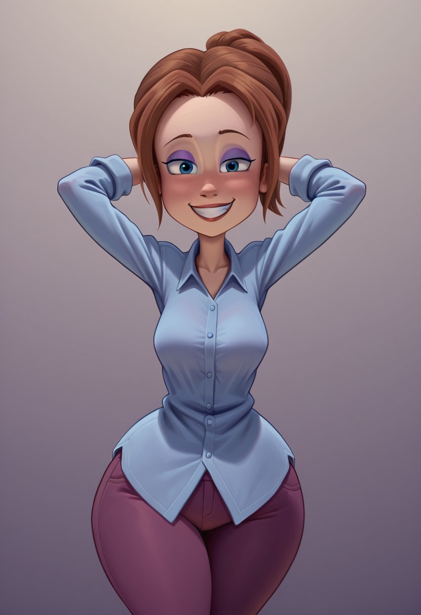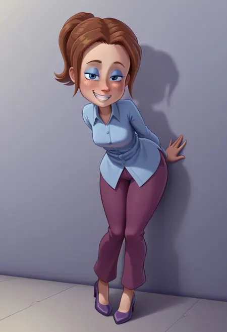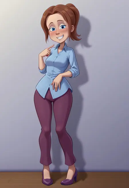DnN1kle_AB, 1 girl, solo, brown hair, ponytail, blue eyes, makeup, wide hips, blue shirt, collared shirt, purple pants, purple heels,